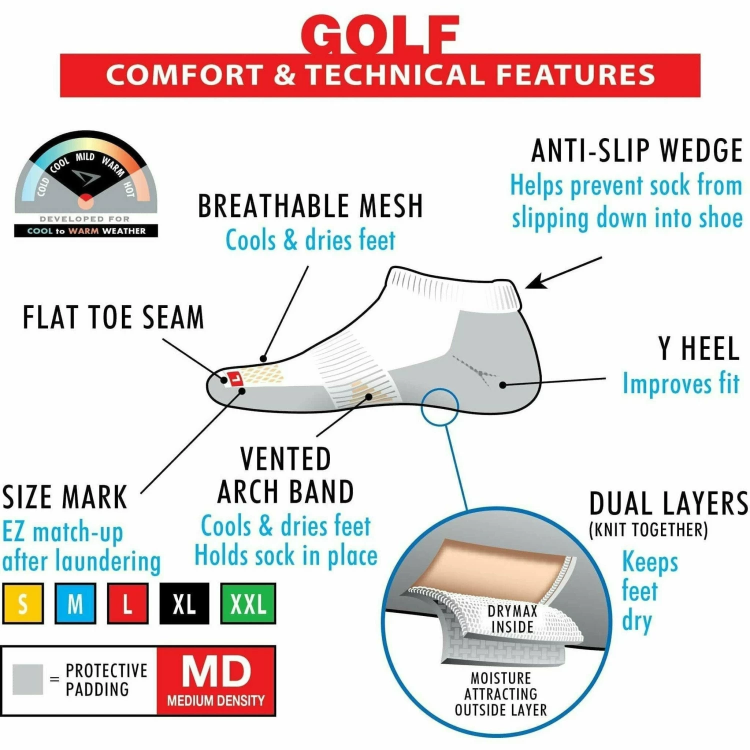 The Drymax Golf Crew Sock is a mid-density golf sock. These socks are made with the Drymax dual-layer design, which utilizes an ultra-absorbent inner layer that wicks sweat and water to a moisture attracting outer layer. These two layers combine to keep moisture off of the foot, resulting in a dryer, more comfortable feel.